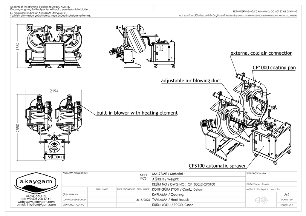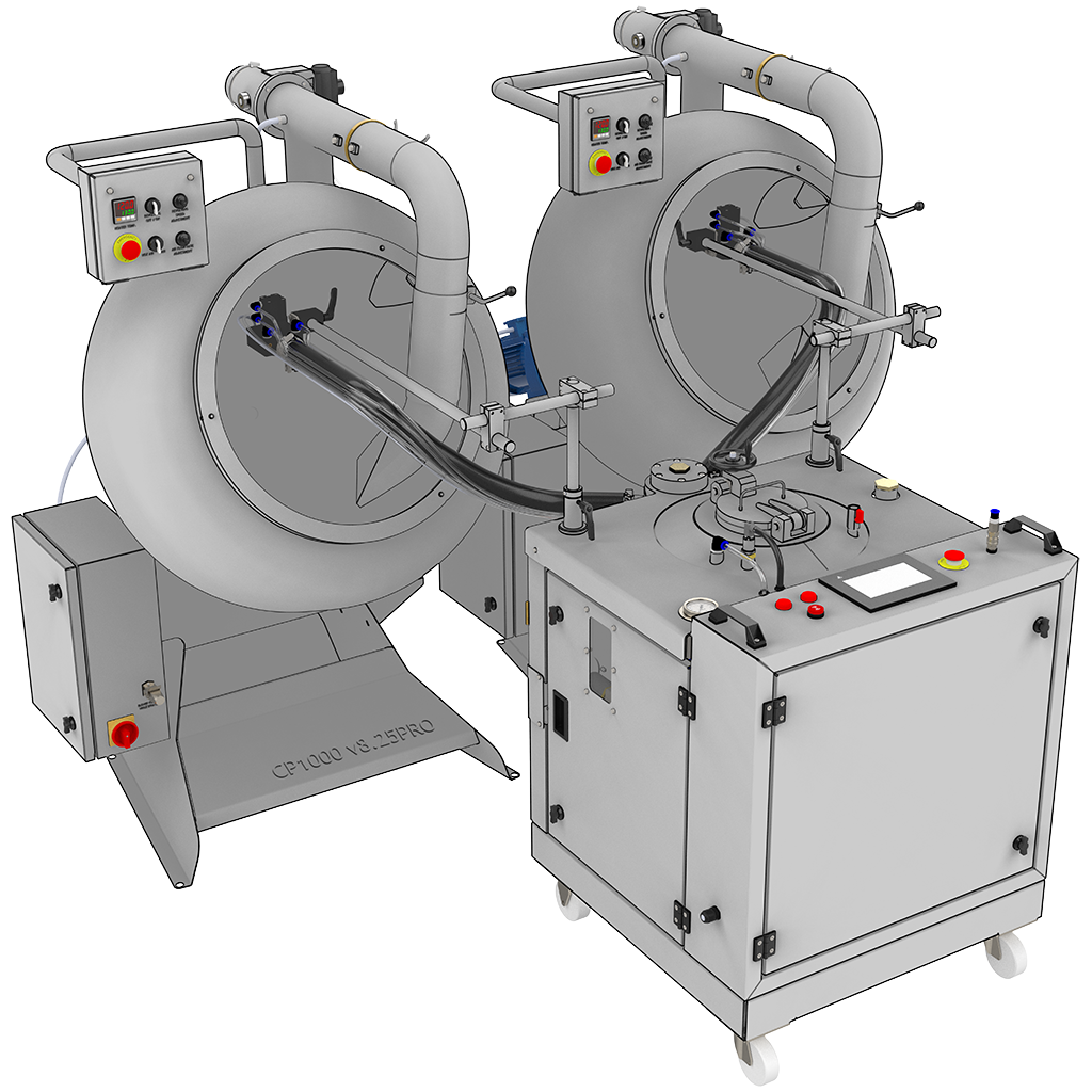 A second spraying unit can be easily coupled to the single spray nozzle machine that we produce as standard. With two spraying units machine can spray simultaneously on two coating pans.