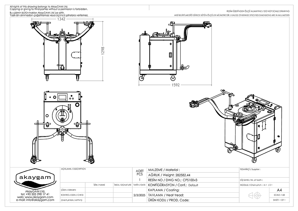 The sprayer for coating pan is a device designed to automatically spray chocolate into the panning machine. Chocolate reservoir, flexible hoses, and the spraying nozzles of the machine are with heating control, ensuring that the chocolate inside the spraying machine remains liquid. Total spraying quantity, time to activate, and time to deactivate the chocolate feeding can be adjusted on the touch screen. The automatic sprayer can be used to spray sugar syrup as well.